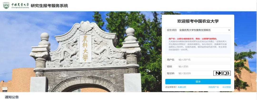 9月11日12时0分至9月17日23时59分,学校招生系统统一开放,凡符合上述申报条件且有意愿报考我校的优秀应届本科毕业生(包括本校和外校),须登录“中国农业大学研究生报考服务系统”填报信息,提交成功后下载保存《中国农业大学推免生预报名志愿填报信息表》(注:1.各学院报名时间小于或等于此时间范围;2.有望取得本校支教团、2+X、工程硕博士专项等推荐免试资格的本科生也需要项目要求的报名时间段内登录报考系统报名)。
