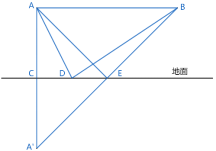 几何问题。如图所示,假设A为悟空所在位置,A′为其相对地面的对称点,B为二郎神的位置。分身必须在地面反弹一次,分身到达二郎神的位置所走的路线有多种,如折线ADB所示。要使折线长度最短,则反弹点应位于A′B与地平线的交点E,AA′=2米,则最短距离为AE+EB=A′E+EB=A′B=米。