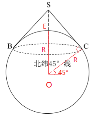 分析易知应为切点在北纬45°上,所以OC与赤道线成45°,则角SOC=90°-45°=45°,则三角形SOC为等腰直角三角形。可得因为OC=R,所以SO=,所求S到地球北极点的距离=SE=SO-EO=-R=(-1)R。