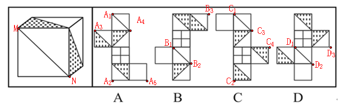 本题考查六面体的展开与折叠。左侧立体图形中,正面图形的对角线对应的两个顶点M、N(如下图所示),分别是顶面阴影三角形和右侧面阴影三角形的直角顶点。