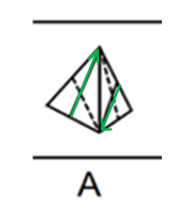 A项,该项中的两个面都有一条实线和一条虚线,左侧展开图中类似的面只有C面和D面,选取左侧展开图中的D面,沿实线画一个绿色的箭头,则箭头的左下角对应的顶面M是D面中虚线的端点。以同样的方式在A项立体图形中画箭头,如图: