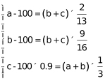 ,联立方程组,解得a=200,b=370,c=280。则甲、乙、丙三人开始时一共带了a+b+c=200+370+280=850元。