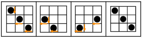 如上图所示,左上角黑点每次向下移动一格,余下两个黑点每次向左移动一格,根据此规律得出接下来黑点位置如图所示。
