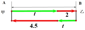 行程问题。设两车第一次相遇时所用时间为t。运动过程如下图所示。绿色部分为甲运动轨迹,红色部分为乙运动轨迹。设甲运动速度为,乙运动速度为。