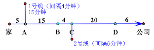 要保证9点到达公司,则需8:54到达D站,最迟8:34从C站出发。但由于C站需换乘2号线,2号线早上6点首发,每6分钟一趟,到8:34共过了154分钟,154÷6=25……4。期间发出25趟车,最晚一趟发车时间为8:30,故小李最迟在8:30到达C站,最迟8:26到达B站,最迟8:11到达A站。但由于A站需乘坐1号线,1号线早上6点首发,每4分钟一趟,列车从1号线起点到A站需行驶15分钟,故首班1号线在6:15到达A站,后每4分钟一趟,6:15到8:11共过了116分钟,116÷4=29,1号线8:11时刚好到达A站,故小李最迟8:11到达A站,则最迟8:06从家出发。