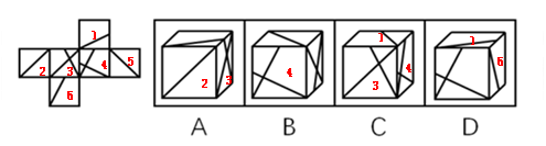 【思路】A项:假设正面2与右侧面3正确,此时顶面线条与实际顶面1的方位不一致,排除;B项:假设正面4正确,此时右侧面与顶面图形均错误,右侧面应为对角线面5,顶面应为顶点与棱中点相连接的面1,排除;C项:可由左侧展开图折叠而成,保留;D项:左侧展开图中的面1和面6应该是相对面,但该项中出现在了相邻面的位置上,故不能折叠得到,排除。