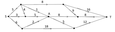 简单计算。从S到T有经过A点路径的和不经过A点路径的。不经过A点的路径有3条,长度最短为5+8+16=29,选项最大才为24,所以排除,所以可知,最短路径一定经过A点。可由A点将路线分为两部分,从S点到A点,以及由A点到T点。从S点到A点,共有4条路线,最短的路线为5+1=6千米,从A点到T点,有2条路线,最短的路线为8+8=16千米,此时最短距离为6+16=22千米。