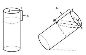 几何问题。根据题干可知,倾斜后液体没有流出,则倾斜前后圆柱体的空余部分体积相等。设直立时空余部分的高为h1,倾斜后空余部分的高为h2,圆柱体的底面积为S,则S×h1=S×h2,化简可得h2=2h1。已知“4为高的圆柱体内装了高度为3的液体”,则h1=4-3=1,h2=2×1=2。已知圆柱体的底面半径为1,则AC=2=h2,所以△BAC为等腰直角三角形,∠ABC=45°,则倾斜角为45°。