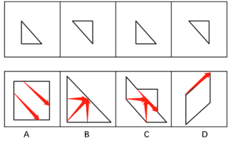 本题考查平面拼合,D选项当中标红的线在题干四个小图形当中找不到对应的边,故排除;将A、B、C选项进行分割,发现A选项无论怎样分割都没有办法分割成题干这样方向的四个三角形,排除;B选项分割后四个三角形的方向和题干不一致,排除;C选项分割后的四块和题干四个三角形的方向一致。
