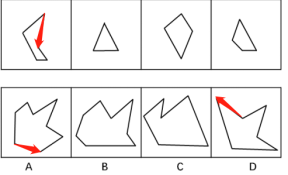 本题考查平面拼合,A、D选项中标红的线在题干四个小图形当中找不到对应的边,故排除。题干第一个图形标红的线为单一斜率的边,即剩余三个图形都没有与之平行的边,那么这条边在拼合后的图形轮廓中必定会体现出来,排除C。