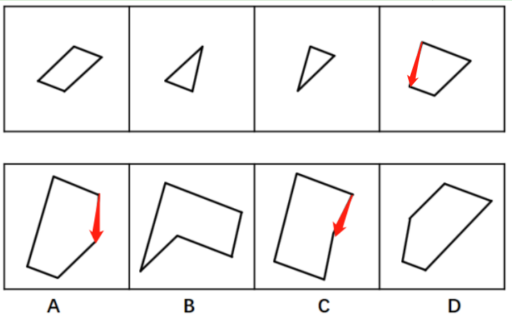 本题考查平面拼合,此题可根据定轮廓法和反向定轮廓法来确定答案。题干第四图中标红的线为单一斜率的边,即四幅图里没有其他边与之平行,所以这条边必定在拼合成的图形轮廓中体现出来,排除D项;AC两项中标红的线在题干四幅图中均找不到对应的边,排除。