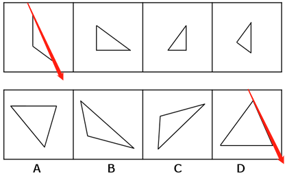 本题考查平面拼合,此题可根据定轮廓法来确定答案。题干四幅图当中图一标红的线为单一斜率的边,即四幅图里没有其他边与之平行,所以这条边必定在拼合成的图形轮廓中体现出来。