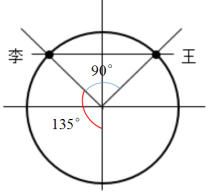 方法一:转一圈20分钟,现在已经转了五分钟了,说明小王已经转了90度。要想小王和小李到达同一高度,则他们必须关于摩天轮中心轴成左右对称,且两者夹角始终保持90度。如图所示: