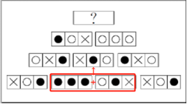 观察图形变化,图形相似度高,所包含相同元素,优先考虑规律叠加。图中关系呈现金字塔形,第一层为四组,第二层为三组。故考虑叠加方式如图所示: