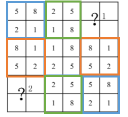 题干图片分为横纵各6行,横纵两行为一组,共分为9组,观察前两行,发现每格都是同样的数字1,2,5,8,数字按照顺时针一格为单位变动,中间两行为逆时针变动,后两行为逆时针变动,与规律相符的为D项。
