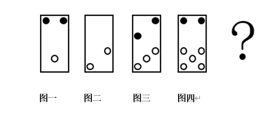 观察题目图形,一条式,从左到右找规律。元素组成不同且无明显属性规律,优先考虑数量规律。题干由若干小元素构成,考虑元素的数量。图一和图二中的黑点和白点的数量分别相加等于图三中黑点和白点的数量,图二和图三中的黑点和白点的数量分别相加等于图四中黑点和白点的数量,依此规律,图三和图四中的黑点和白点的数量分别相加等于问号处图形中黑点和白点的数量,只有 B 项符合。