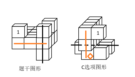 划线垂直处表示为立体图形第二层,选项C画菱形格处为空白,与题干图形不一致。