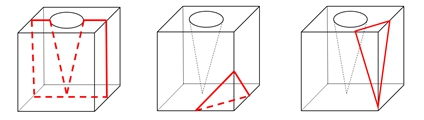 观察题干图形,B、C、D三项图形均能切出,无法切出A项图形,A项图中应为圆形,若斜切A项,图形外侧应该更长,内部为椭圆形,如下图所示: