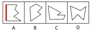 本题考查平面拼合,此题可根据定轮廓法来确定答案。题干四幅图当中图二标红的线为单一斜率的边,即四幅图里没有其他边与之平行,所以这条边必定在拼合成的图形轮廓中体现出来。四个选项只有A选项的轮廓存在这条边。