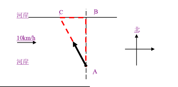 水流往东时,船往西偏北航行,再由流速可知,水会使船单位时间内向东偏移,则需要使船到达B点即是船速与水速构成直角三角形ABC,已知船速为水速的2倍,则AC=2BC,则∠CAB=30°。