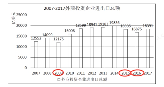 年。但由于无2006年数据,故比较时需要减去,所以总年份为10年。故外商投资企业进出口总额同比下降的年份占比为