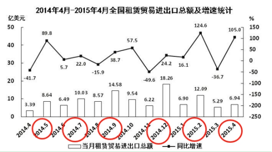 本题题干为“2014年5月~2015年4月间,全国租赁贸易进出口总额及同比增速均高于上月的月份有几个”,根据题干可知,本题考查直接查找。根据图形材料如下图,可知全国贸易总额及增长率均高于上月的有2014年5、7、9、12月和2015年2、4月,共6个月份。
