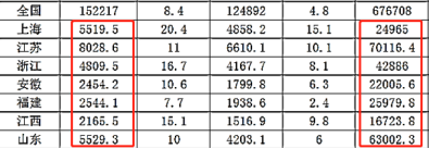 观察GDP各地数据皆为几万的数字,那么一个万位数的10%,相当于原来数据小数点向前移动一位,所以只需要比较GDP×10%与一般公共预算各地数值的前几位有效数字大小即可。也就是上海、江苏、浙江、安徽、江西的一般公共预算收入与GDP的比值大于10%。
