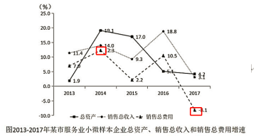 本题所求为“2013-2017年该市服务业小微样本企业销售总费用增速最快、最慢的年份分别是哪一年”,为增长率比较大小问题。根据图表信息可知,
