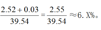 本题题干为“2019年广东规模以上工业企业用水量中,地表与地下淡水量约占百分之几”,可知本题考查现期比重计算。根据第一段文字材料“2019年,广东规模以上工业企业用水量39.54亿立方米,分水种看,自来水用水量最大,达35.67亿立方米,占全部用水量的90.2%;地表淡水用水量2.52亿立方米,地下淡水0.03亿立方米,其他水1.32亿立方米”,结合公式: