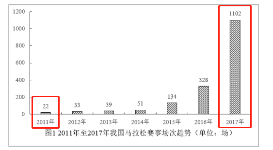 本题题干为“2017年我国马拉松赛事场次比2011年增加了”,结合选项可知本题考查倍数计算。根据图片可知,2011年我国马拉松赛事场次=22场,2017年我国马拉松赛事场次=1102场。