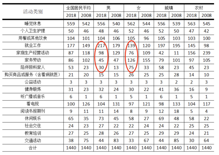 对比可知,2018年,我国男性居民和女性居民花费在家务劳动活动上的平均时间的绝对差异最大。