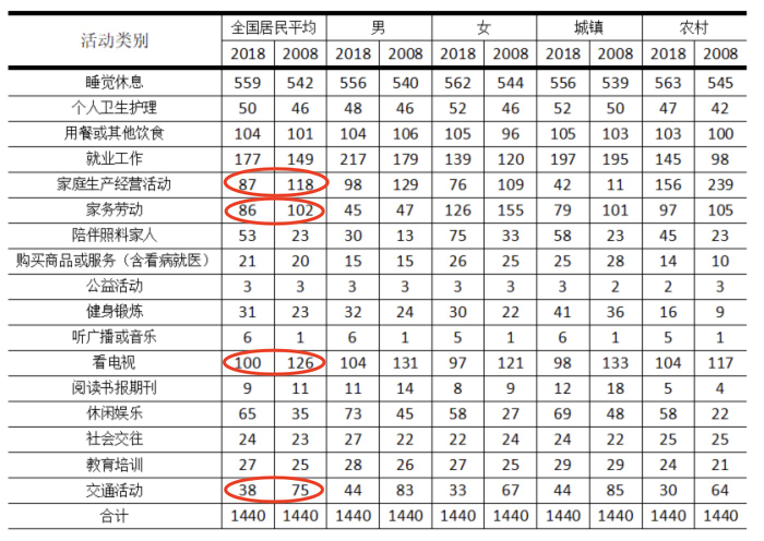 对比可知,与2008年相比,2018年全国居民花费在交通活动上的平均时间减少幅度最大。