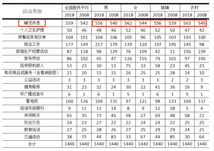 对比可知,与2008年相比,2018年我国男性居民花费在睡觉休息上的平均时间的增速最低。