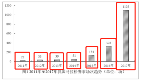 C项:根据图表可知,2011年至2017年的赛事场次分别为22场、33场、39场、51场、134场、328场、1102场。所以2011年至2016年我国马拉松赛事场次之和=22+33+39+51+134+328=607场,2017年赛事场次的50%=1102×50%=551场,607>551,C项正确,当选。