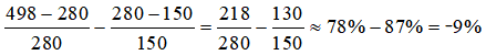 本题题干为“2017年马拉松赛事参与人次的同比增速比2016年”,可知本题考查普通增长率的计算问题。x100%,根据第一段可知“2017年马拉松赛事的参与人次达到了498万人次,2016年、2015年马拉松赛事的参与人次分别为280万人次、150 万人次”,代入公式可得,2017年与2016年同比增速的差值为,则2017年的同比增速比2016年慢约9%。
