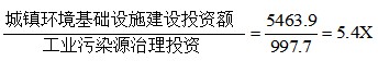 本题题干为“2013—2017年,当年完成环保验收项目环保投资最高的年份其城镇环境基础设施建设投资额约是工业污染源治理投资额的多少倍”,根据题干描述以及关键字“倍”可知本题考查倍数计算。由于求解为某一年城镇环境基础设施建设投资额约是工业污染源治理投资额的倍数,而题干要求为当年完成环保验收项目环保投资最高的年份,故需先判断投资最高的年份,根据表格倒数第二行可知,环保投资最高为3113.9亿元,对应年份为2014年,结合倍数=A/B,代入数据