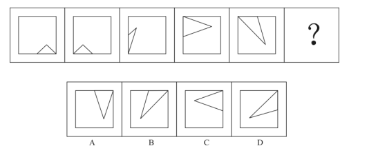 观察题干图形,每幅图都有三角形和正方形,元素组成相同,且图形较为相似,优先考虑位置变化规律。观察发现,三角形与正方形的公共边,沿正方形的外边框每次顺时针平移半条边,则问号处图形中公共边应位于正方形上边框的右半部分,可排除C项和D项。继续观察发现,三角形顶点的移动轨迹可看作正方形,顶点每次顺时针平移到的位置恰好位于正方形轨迹的顶点处,故问号处应选择一个三角形顶点位于正方形内部左下角位置的图形,只有B项符合。