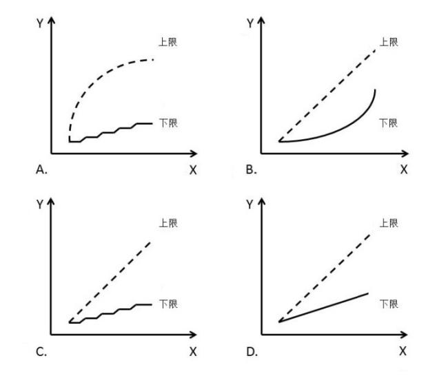 某集团三个分公司共同举行技能大赛,其中成绩靠前的X人获奖。如获奖人数最多的分公司获奖的人数为Y,问以下哪个图形能反映Y的上、下限分别与X的关系?