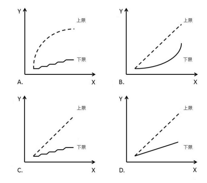 某集团三个分公司共同举行技能大赛,其中成绩靠前的X人获奖。如获奖人数最多的分公司获奖的人数为Y,问以下哪个图形能反映Y的上、下限分别与X的关系?