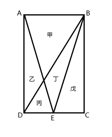 一块种植花卉的矩形土地如图所示,AD边长是AB的2倍,E是CD的中点,甲、乙、丙、丁、戊区域分别种植白花、红花、黄花、紫花、白花。则种植白花的面积占矩形土地面积的: