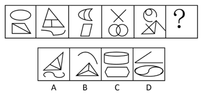 观察题干图形,每幅图形均由上下两部分组成,第1、3、5图均为曲线图形在上、直线图形在下;第2、4图均为直线图形在上、曲线图形在下,呈周期性交替规律,排除B、C项;继续观察,题干中每幅图形均存在3个封闭区域,排除D项,只有A项符合。