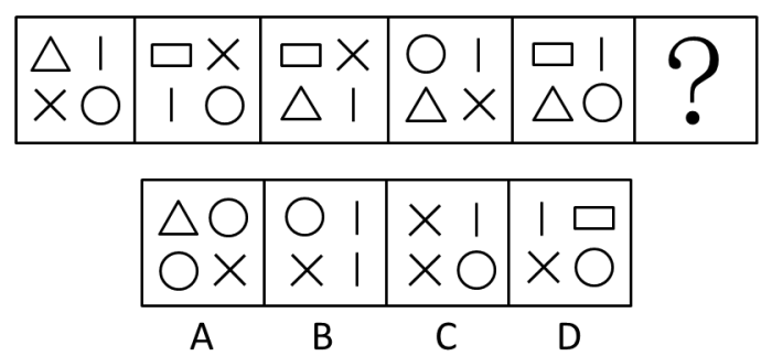 • 从所给的四个选项中,选择最合适的一个填入问号处,使之呈现一定的规律性: