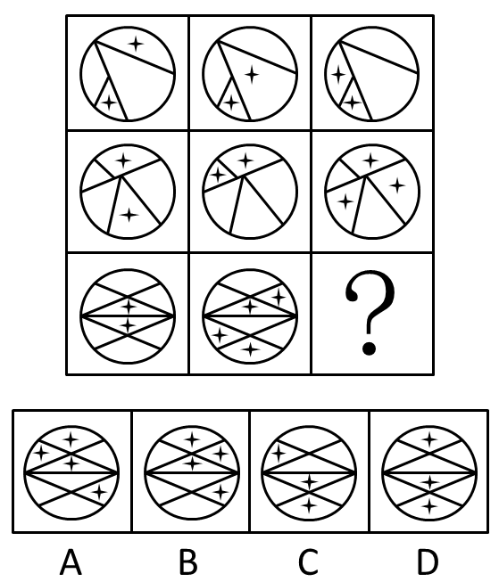 观察图形变化,相似度高。图形相似题型考查位置关系和组合叠加。题干所有图形外部轮廓相同,图形内部四个封闭区域内或含有星星图案或不含有星星图案。首先排除位置关系的变化规律。所以考虑图形的组合叠加。再观察图形放在九宫格内考查,优先横向比较规律。观察第一行,可以得出:星+白=白,白+白=星,星+星=星,白+星=白;第二行规律同上;因此第三行也遵循上述规律,只有A项符合。