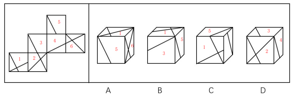 D项:以面3、4相邻面为基准面,六面体中面2上的线条与面3、4的相对位置与展开图不一致,排除;