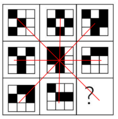 观察题干图形为黑白块,且以九宫格形式呈现,考虑规律叠加,但是发现横向、纵向都无规律,考虑“米”字型规律叠加,如图所示: