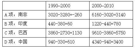 本题题干为“以下符合1990‒2010年二十年间人均GNI变化趋势的国家是”,结合材料数据可知本题所求为增长量计算。根据表格材料倒数第一、二、四、五行可知南非、印度、巴西和中国等国家人均GNI,结合公式:增长量=现期值-基期值,代入数据可得1990‒2000、2000‒2010这两个时间段南非、印度、巴西和中国的人均GNI增长量,如下表(单位:美元):