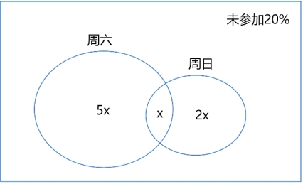 设两天的活动都报名参加的为x人,则只报名参加周日活动的为2x人,即报名参加周日活动的为3x人。根据“报名参加周六活动的人数与报名参加周日活动的人数比为2∶1”,则报名参加周六活动的为6x人,即只报名参加周六活动的为6x-x=5x人。可得:80%的职工报名参加,对应人数为5x+x+2x=8x,则20%的职工未报名参加,对应人数为2x。