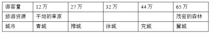 结合条件(3)(4)可得,冀城游客比兖城游客多,且兖城的游客已经为44万,故冀城游客应为65万,在结合条件(1)可知冀城的旅游资源为茂密的森林。如下表所示: