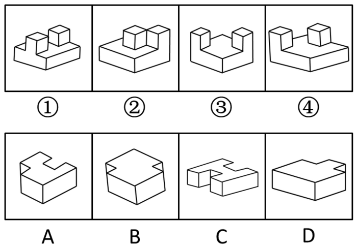 ①、②、③、④为四个多面体零件,问A、B、C、D四个多面体零件中的哪一个与①、②、③、④中的任一个都不能组成长方体?