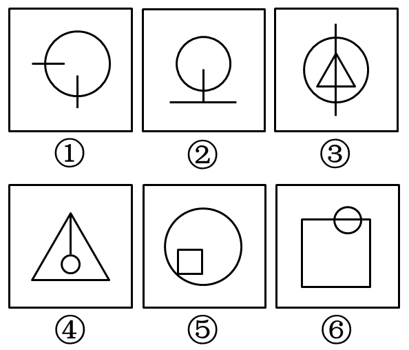 题干图形均由直线和曲线构成,而且直曲交点数量明显,可根据直曲交点的数量将其分为两组:①③⑥直线与曲线的交点数为2;②④⑤为直线与曲线的交点数为1。